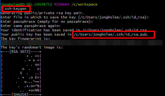 공개키가 /c/Users/jongholee/.ssh/id_rsa.pub에 생성되으므로 해당 경로로 가서 키를 확인한다.cat /c/Users/jongholee/.ssh/id_rsa.pub